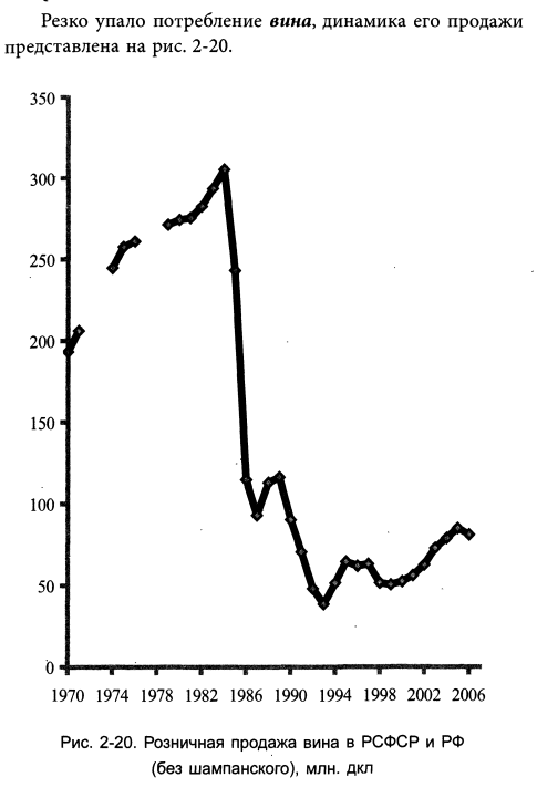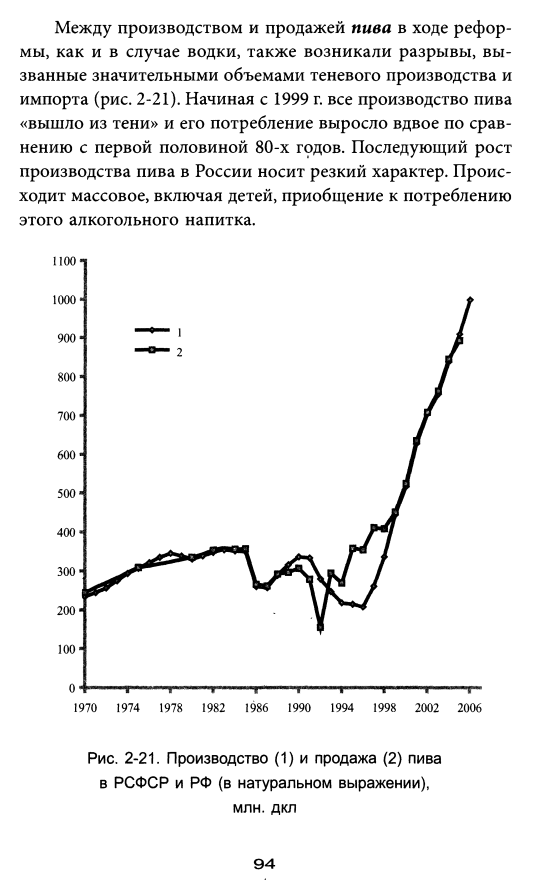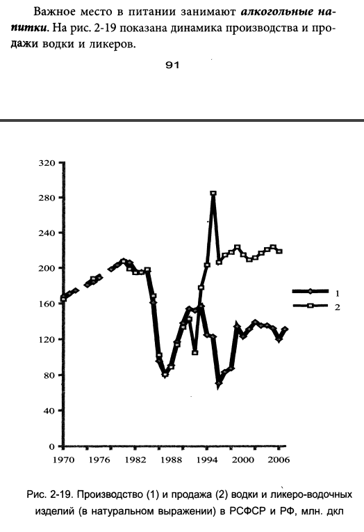"Результатом реформы стал и тот новый для России факт, что значительная часть продуктов питания, поступающих в торговлю, фальсифицирована. Масштабы фальсификации, судя по сводкам МВД, огромны. Фальсифицированную водку потребляют миллионы людей — из них ежегодно около 30 тысяч (а в 1994 г. — 55,5 тыс. человек) кончают смертельным исходом. В результате реформы произошла архаизация всей системы производства и распределения продуктов питания. Прежде всего, резко сократилась доля сырых продуктов, перерабатываемых в пищевой промышленности. В животноводстве и переработке продукции имело место снижение1
