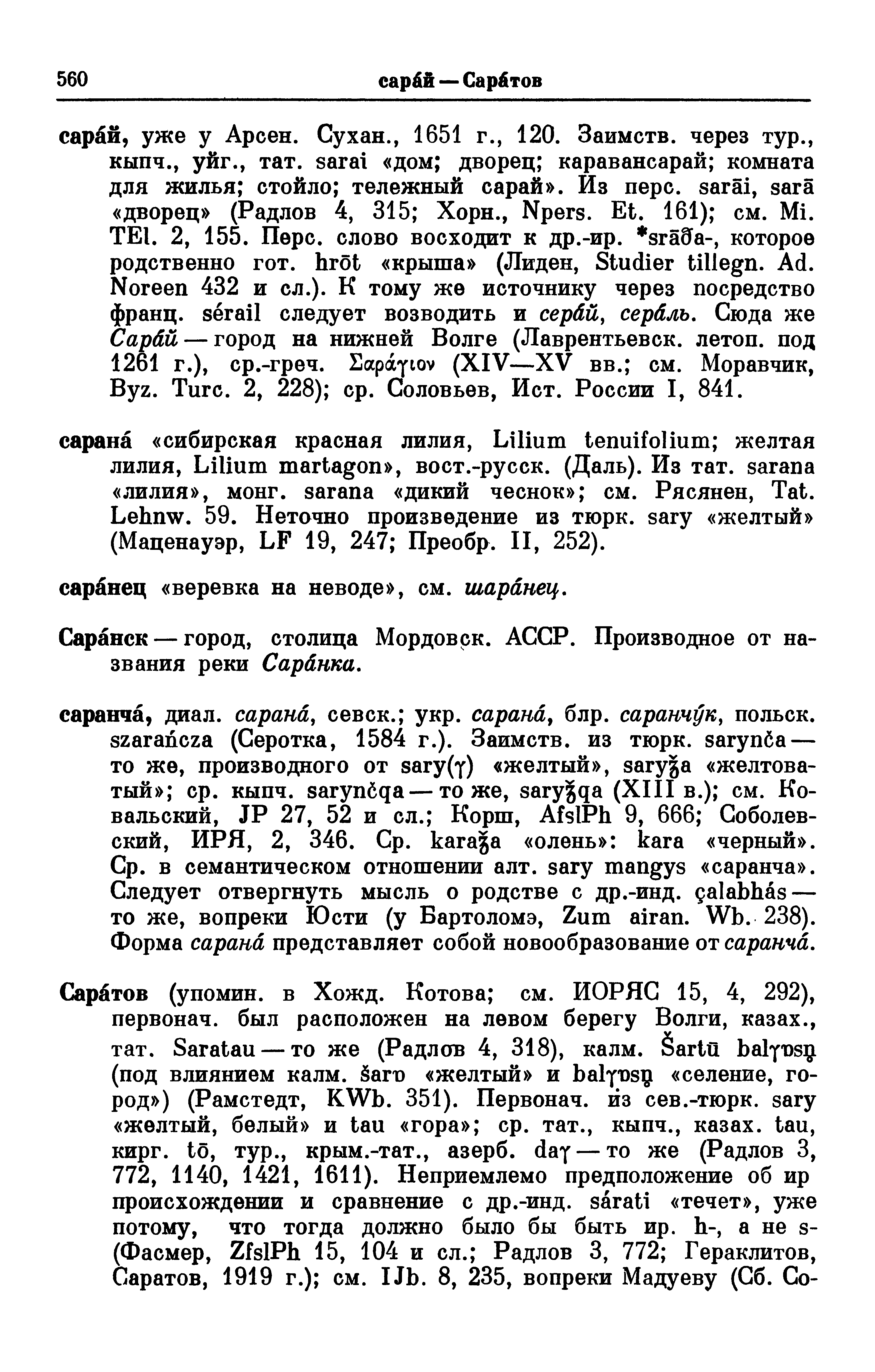 По поводу Сарай см.: Фасмер М. Этимологический словарь русского языка. - М., 1987. - Т. III. - С. 560:
