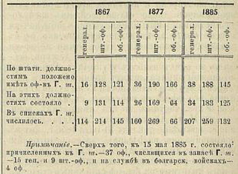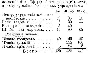 О численности русского Ген. Штаба дает представление следующая таблица из того же источника. (Обратите внмание на соотношение генералов, штаб- и обер-офицеров у нас и у немцев).