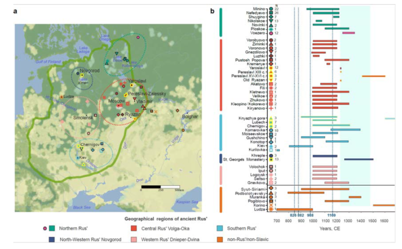 .  Наши результаты показывают генетическое континуум, сформированное преимущественно двумя ключевыми генетическими группами: обширная славянская непрерывность различных генетических подкластеров Руси, занимавшей огромную территорию Европейской равнины, и финно-угорская (уральская) составляющая в северной части Руси. Важно отметить, что обе группы имеют общий генетический субстрат, унаследованный от предшествующих древних балтийских групп. Чтобы оценить масштаб скандинавского («викинговского») наследия, мы проследили небольшие скандинавские генетические линии, которые не составляли доминирующий генетический слой раннего русского государства.