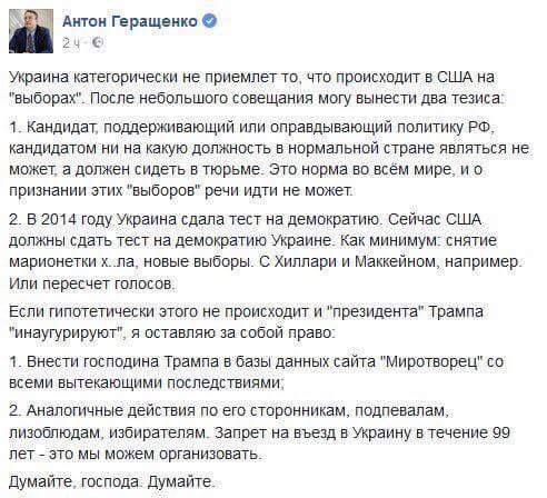 Украина признает выборы в США законными и состявшимися ? Получил Трамп разрешение от Петро Порошенко на вступление в должности ?