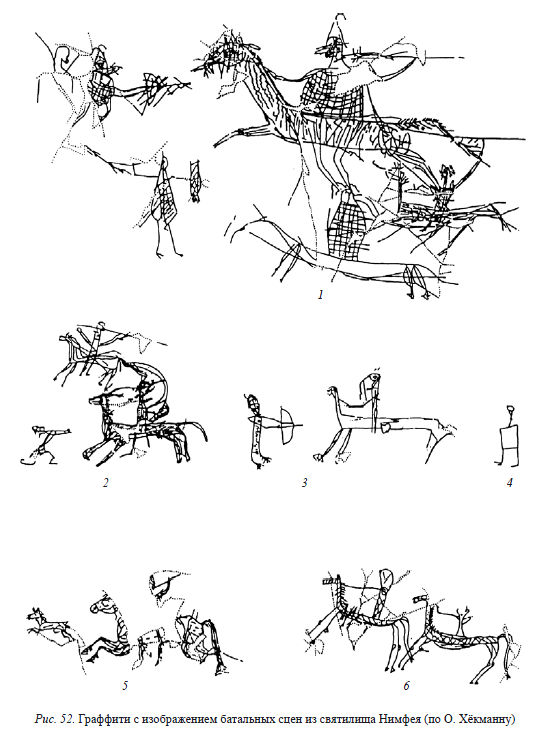 Графитти ниже из издания  Виноградов Ю.А. Горончаровский В.А. Военная история и военное дело Боспора Киммерийского... Предполагается, что пешие лучники - скифы, их побеждают всадники сарматы.